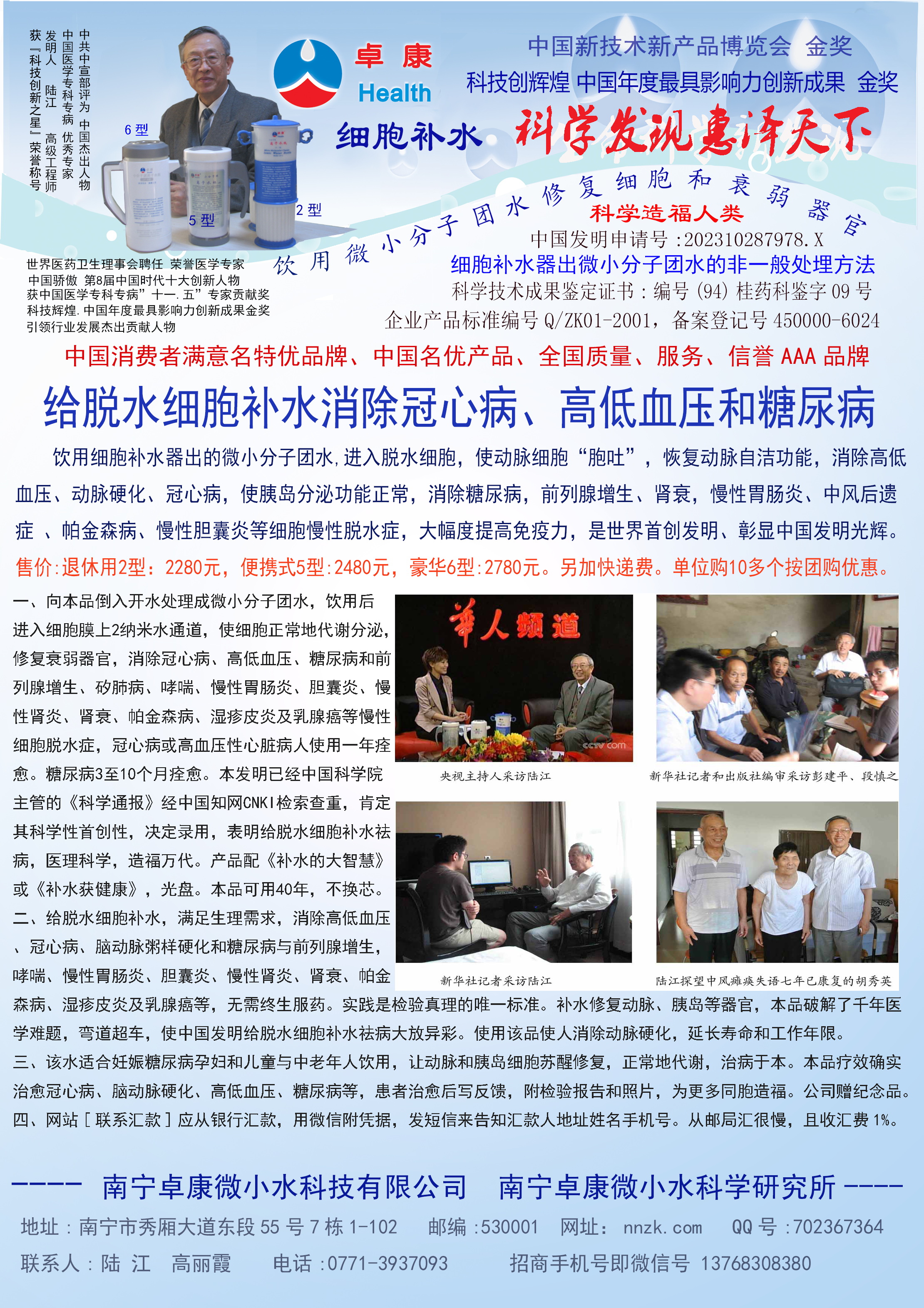 人類幾千年來患以上病癥需終生服藥,幾十年也不能治愈。可是我國南寧的高級工程師陸 江,于1990年想根治高血壓,研究發(fā)明了離子水瓶,處理出微小分子團水供飲用,經過醫(yī)院臨床試用和專家鑒定,1999年獲中國發(fā)明專利權,產品于2000年投放市場后一直跟蹤調查,據(jù)全國各地用戶反饋:祛除了高低血壓、糖尿病和冠心病,并使前列腺增生、咽喉炎、鼻竇炎、慢性氣管炎、支氣管炎、矽肺病、哮喘、慢性胃炎、腸炎、慢性膽囊炎、慢性腎炎、腎衰、膀胱炎、便秘、痔瘡、風濕性關節(jié)炎和濕疹皮炎及中風后遺癥等病癥不藥而愈。為什么喝微小水能治20多種病?陸 江從1991年德國科學家發(fā)現(xiàn)細胞膜水通道僅為2納米獲得啟發(fā),認為多種器官患病是因細胞脫水,不能正常代謝和分裂增殖,才使器官細胞減少致衰弱萎縮而形成細胞缺水性病癥。22年來的實踐有力地支持了“細胞脫水致病”這一重要論點,表明喝微小水可滿足細胞的生理需求,補水就能祛病,是生命科學新亮點。