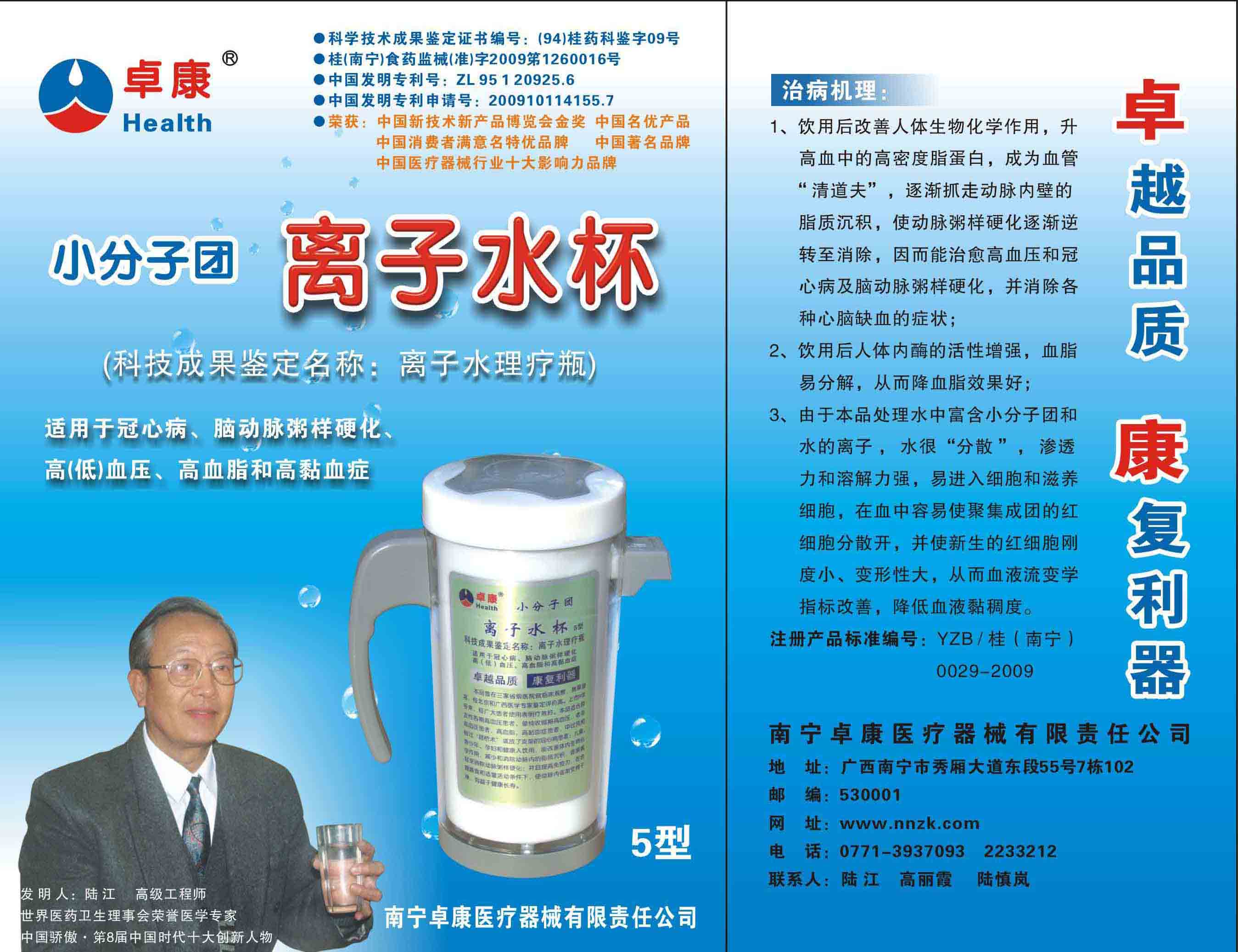 本品大量用戶的使用效果表明,能治愈冠心病、腦動脈硬化、原發(fā)性高(低)血壓、高血脂、高粘血癥、高血尿酸癥(痛風)和2型糖尿病、衰弱器官并發(fā)癥(前列腺增生、腎衰與尿毒癥)及中風后遺癥等療效好。產品配信譽卡。使用壽命30年,不換芯,易清洗。團購優(yōu)惠。從郵局匯款,匯費1%,地址按本頁下方地址、聯(lián)系人寫。從銀行匯款,請點擊[聯(lián)系匯款]欄,從工商銀行匯款,建設銀行、農業(yè)銀行匯款,均免收匯費,匯款后20--30分鐘內發(fā)短信,可用微信轉帳,均免匯費,微信號即手機號13768308380。匯款后,告知你的姓名和地址,我公司聯(lián)系人手機號是:13768308380卓康牌離子水瓶為我公司獨家生產,郵購產品配《補水的大智慧》彩印書一本,另配四季出版社出版的新書《補水的大智慧》一本,并配光盤一張(含央視主持人釆訪陸江的對話視頻)。目前市場和"淘寶網"上有人兜售假冒的偽品,望讀者審察辯別真?zhèn)危旒僬哓飧`假冒本公司的各種證、獲獎獎項、專利號和外包裝盒上的中英文字,包括科技成果的鑒定意見等,請讀者注意防偽。如何識別假貨?已經買了假貨怎么辦?(請點擊[打假掠影][打假掠影])。